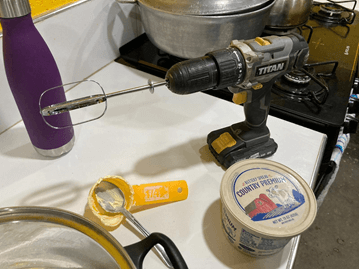 Our newest long termer loves baking and last week she made us brownies (though she said it had to be a dry mix as too many of the ingredients were not available).  It was really good though, and we had them with Tea… a moment of trans-Atlantic harmony.  We didn’t really have the right kitchen gadgets though, so had to adapt (…the ends, justifies the means).